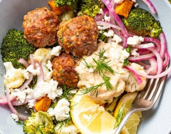 Sheet Pan Mediterranean Meatball Bowls Loaded with Roasted Vegetables